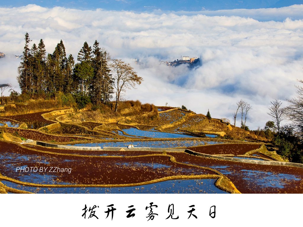层层梯田银波荡漾,倒映着白云蓝天,树木山川,像极了一块块精美的彩色玻璃,并且这个时候看到云海和彩霞的机率的也比较大。