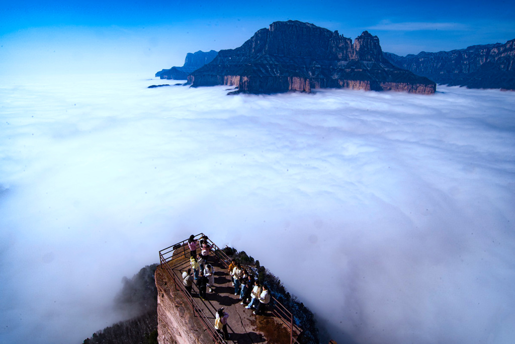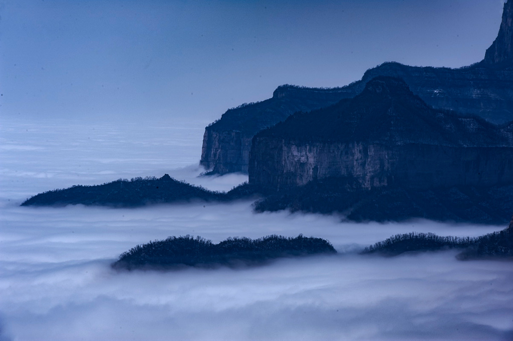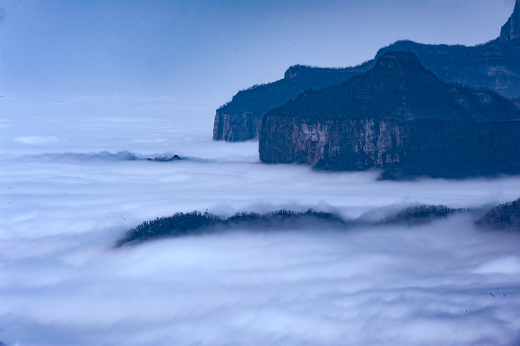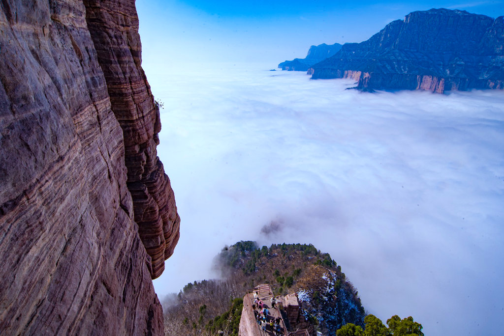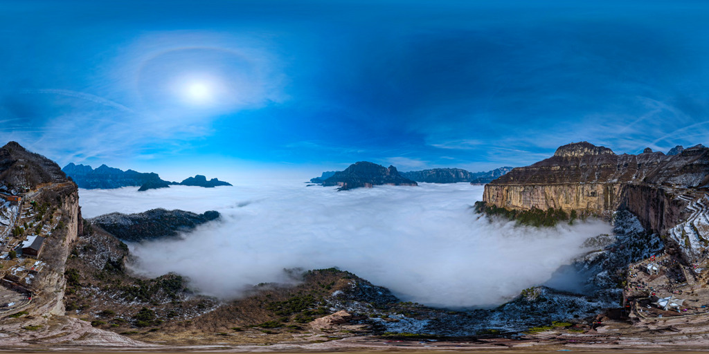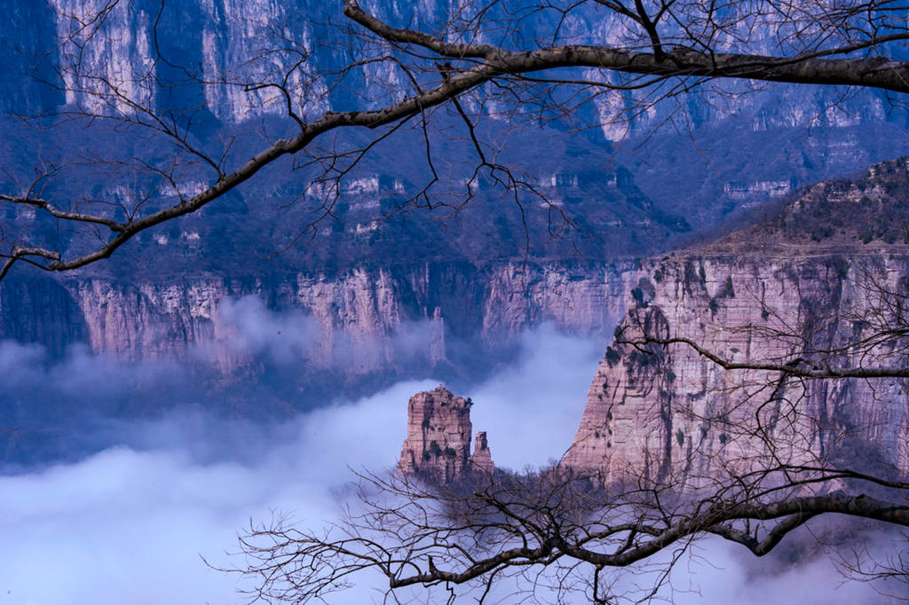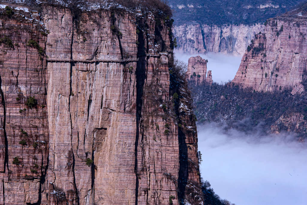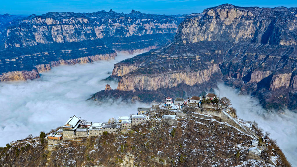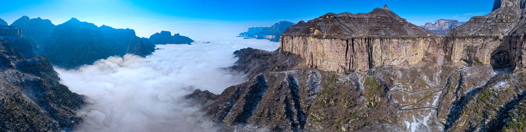 雪后初晴的光影尤为动人,朝阳洒向绝壁长廊,白雪映红岩,冷暖交织、层次丰富;山间云雾时聚时散,山峦若隐若现,栈道悬空、奇峰耸立,构成一幅幅气势磅礴的太行冰雪画卷。