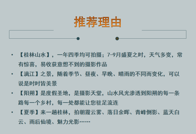 更多摄影路线点击链接: 秀美漓江、阳朔美景、乡村田园魅力永福风光人文6天深度摄影特训营/国协大赛助力