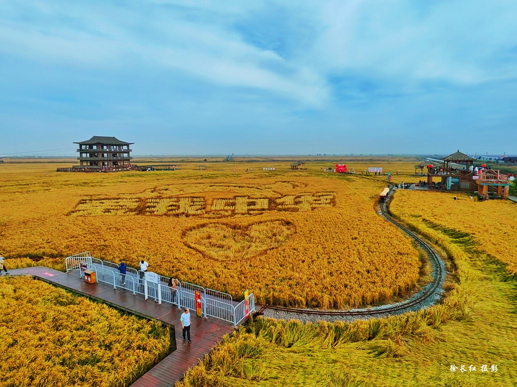 秋日的红海滩国家风景廊道,是大自然挥毫泼墨的极致之作。此时的碱蓬草褪去春夏的浅红,晕染成热烈的绛红、深沉的赤紫,像一块无边无际的红毯,从栈道脚下一直铺向天际,与远处的湛蓝天空相接,划出一道震撼人心的色彩边界。稻梦空间:稻田经巧妙规划,种植不同颜色水稻品种,秋季长成一幅幅精美稻田画。登上观景台俯瞰,金黄稻田与周边红海滩、芦苇荡构成色彩斑斓的秋日盛景,乘坐小火车穿梭其中,更能沉浸式感受田园秋意 。