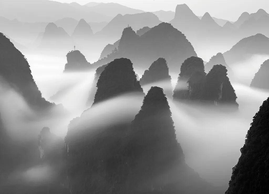 清晨的龙脊,晨雾像纱巾缠在青山的颈间,层层梯田泛着新稻的嫩绿,阳光穿过云层时,田埂的曲线突然被描上金边,戴斗笠的农人弯腰插秧,身影成了绿毯上最生动的标点。午后的漓江是流动的画,九马画山的倒影浸在碧水里,渔翁站在竹筏尾撒网,鸬鹚的墨色身影与两岸的喀斯特山峰,在长焦镜头里叠成水墨长卷。