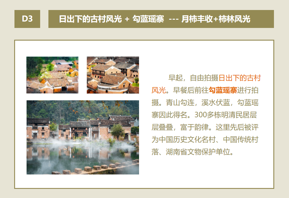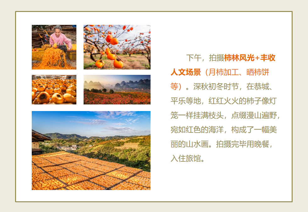 追漓江晨雾漫过碧水青山,拍月柿挂满枝头的红火丰收,探上甘棠古村的千年石板路,访勾蓝瑶寨的瑶族风情,用镜头定格乡村田园的袅袅炊烟与山水秘境的清幽诗意,让每一张照片都盛满湘桂的灵秀与烟火!