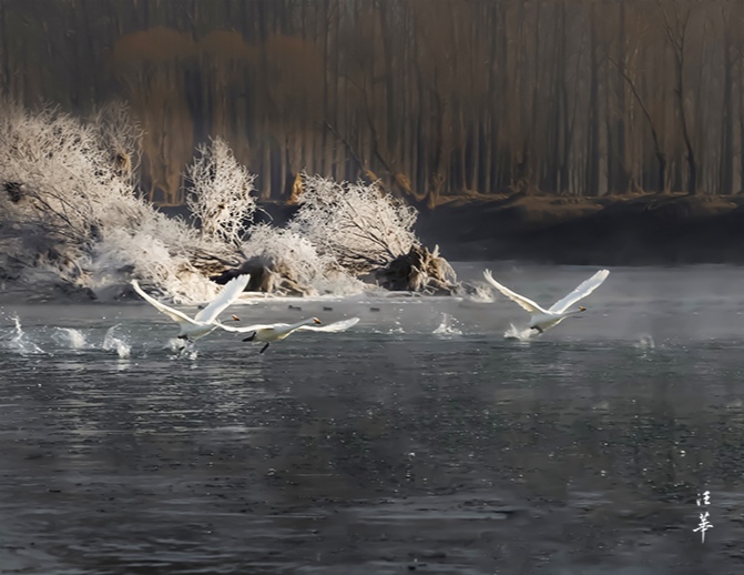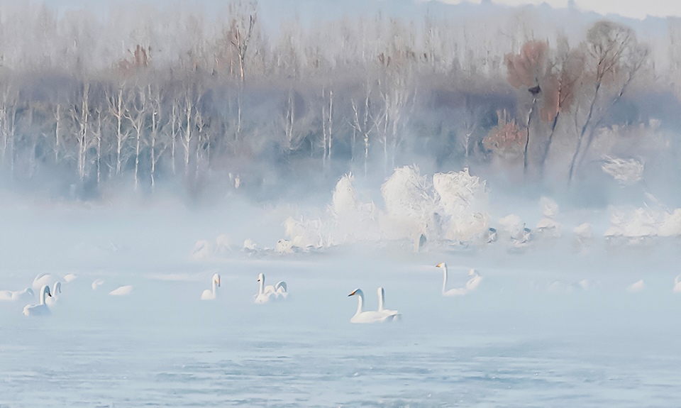 12月17日晨,杨柳湾:雾凇与天鹅共舞的冬日秘境