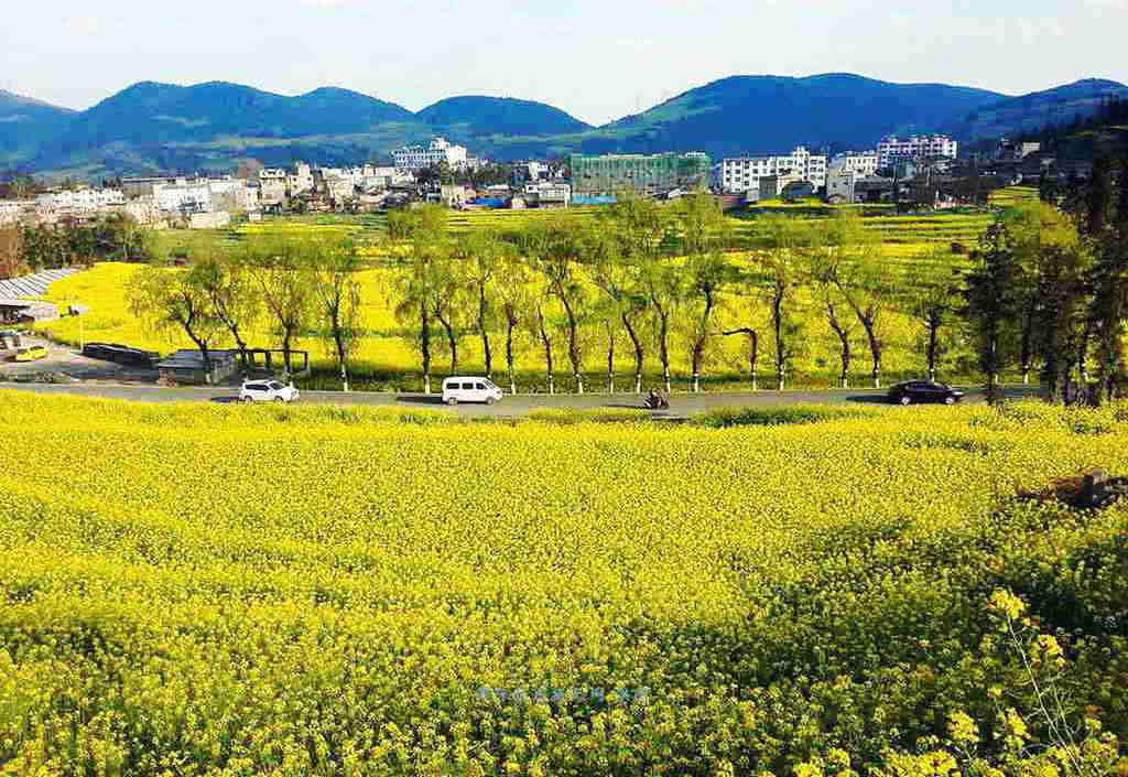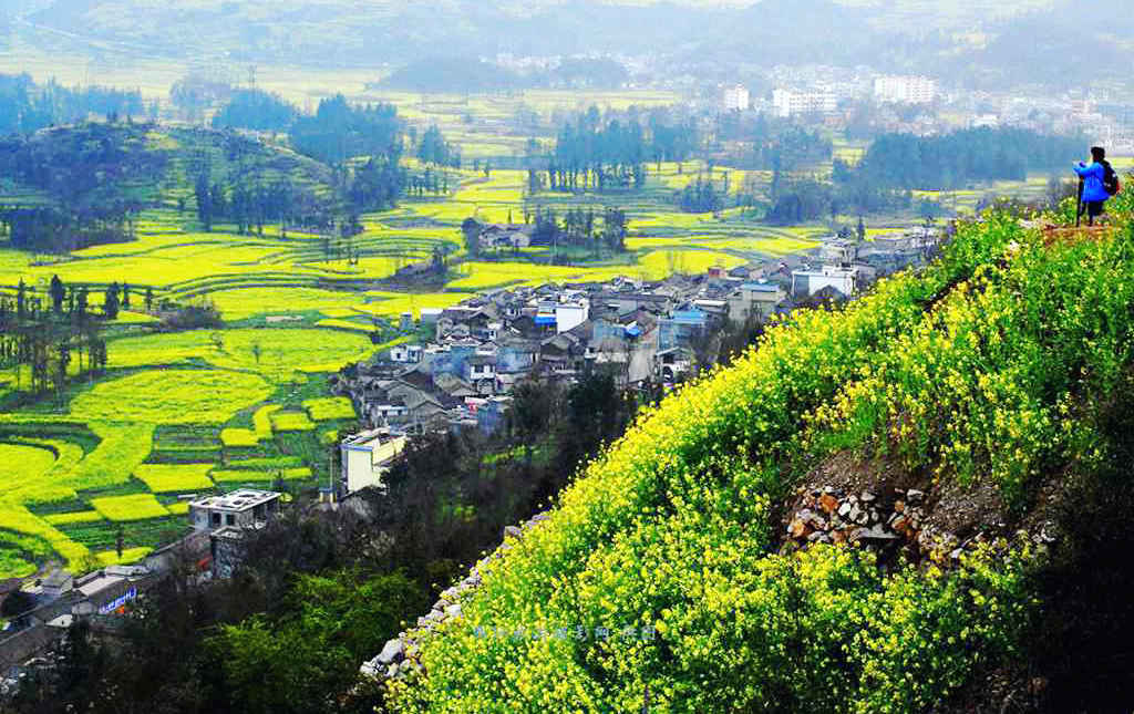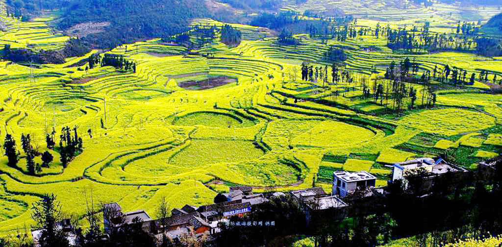 【螺丝田】:位于县城西北十公里处的牛街,“螺丝田”是一个最著名油菜花拍摄点,这里的梯田是圈状的,远远看去真像是螺丝上的旋纹。金黄色的油菜花一圈圈往上延伸,甚是壮观。