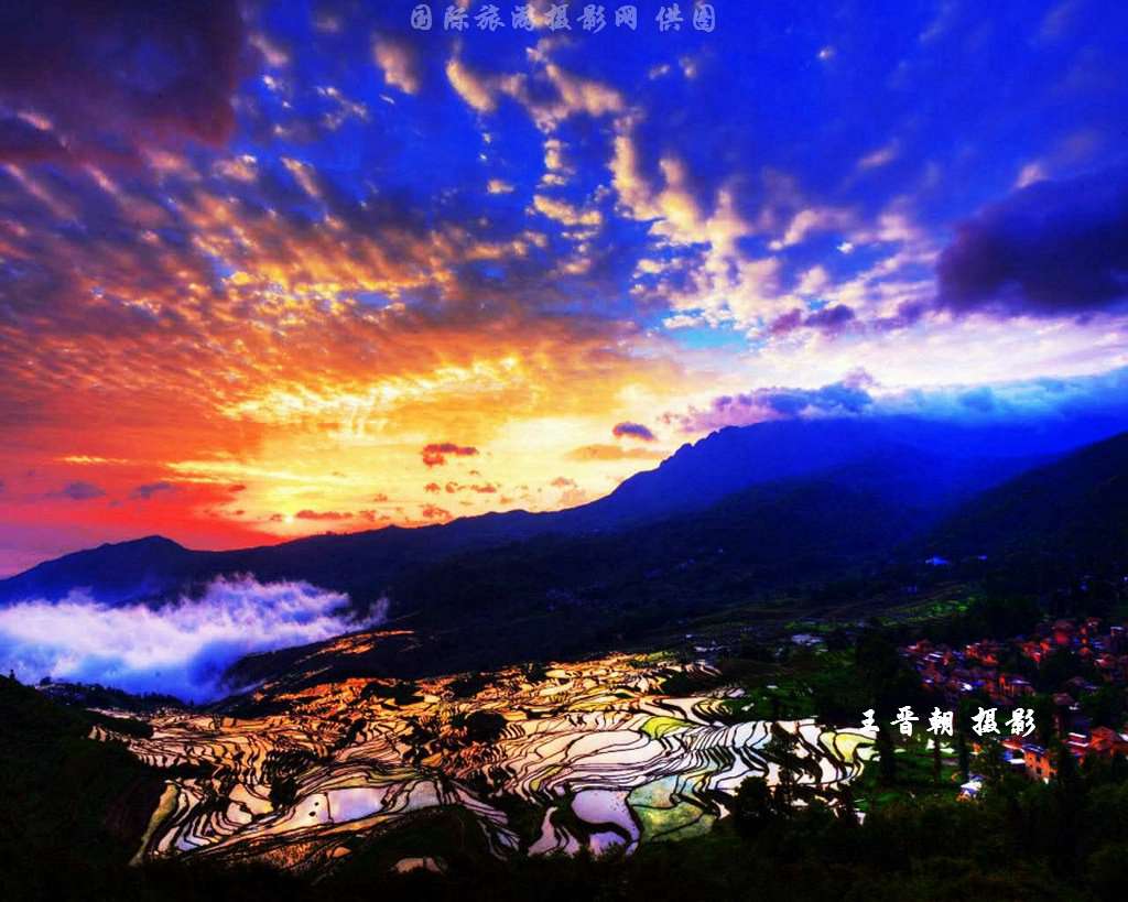 丰富多彩的民族(哈尼族)风情文化,气势磅礡、面积辽阔的梯田,遍布在山山岭岭之间,其日出时,红霞满天、景色壮丽,日落时,金黄的千山万壑,如诗如画,让人赞不绝口,流连忘返。
