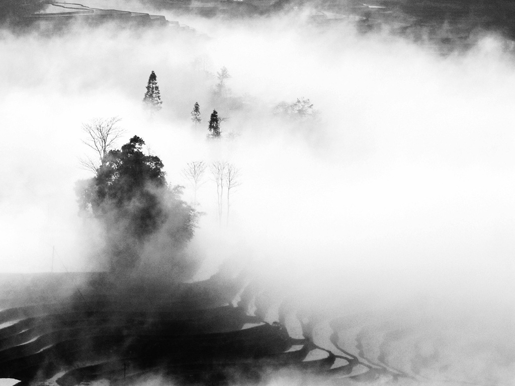 3、云雾袅绕,梯田在漫漫云海的覆盖下,构成了神奇壮丽的景观。