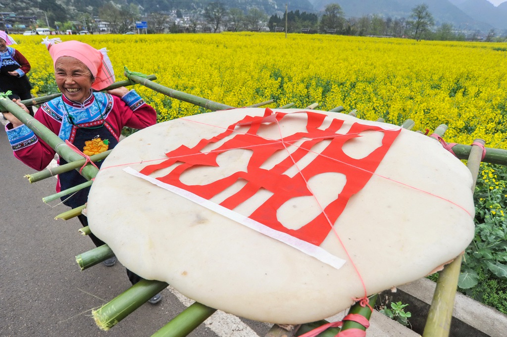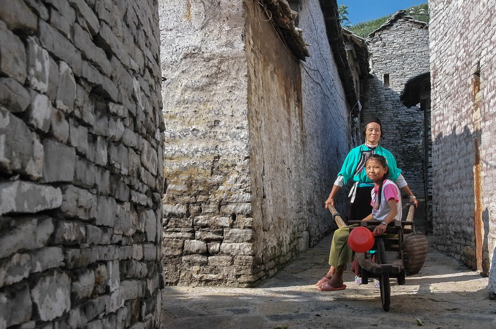 坐着妈妈的独轮车赶场去