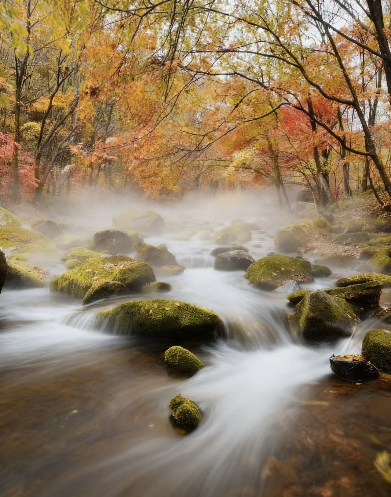 沿着登山步道向上攀登,用 24-70mm 镜头记录沿途风景:光圈 f/5.6,快门 1/400s,ISO 640,捕捉溪流在红叶间穿梭的灵动、登山者的坚毅与层叠的枫海。登上海拔 1200 米的 “枫叶顶” 观景台,用广角镜头俯瞰全景,红叶如浪潮般铺展,山间的小溪如银色丝带蜿蜒穿梭,将红色枫海分割成一幅幅独立的画卷。几位年轻影友举着相机,对着远方的枫海按下快门,他们的身影与壮阔的自然景观相融,彰显着追光者的朝气。下山时路过九曲峡,溪水清澈见底,红叶落在水面形成 “红色航线”,用慢门拍摄溪流与红叶的互动,水流的丝滑与红叶的静态形成鲜明对比,每一张照片都藏着本溪秋色的静谧与灵动。