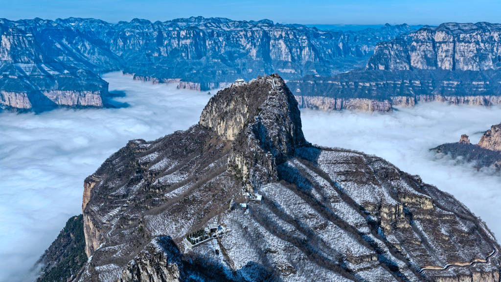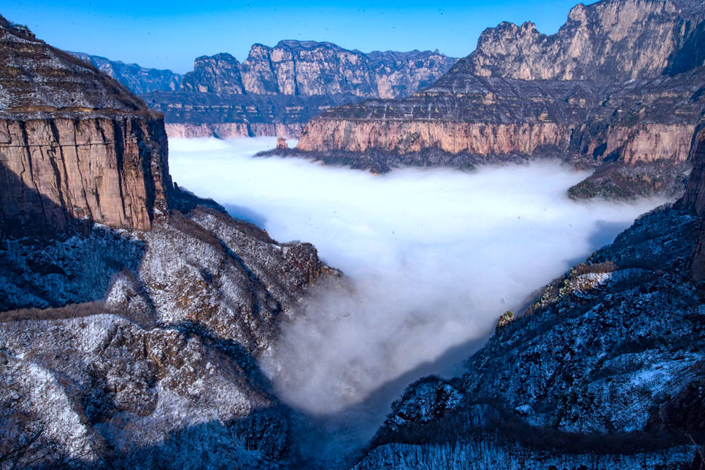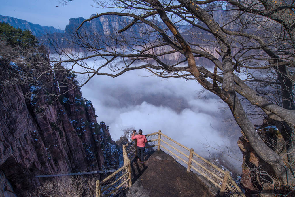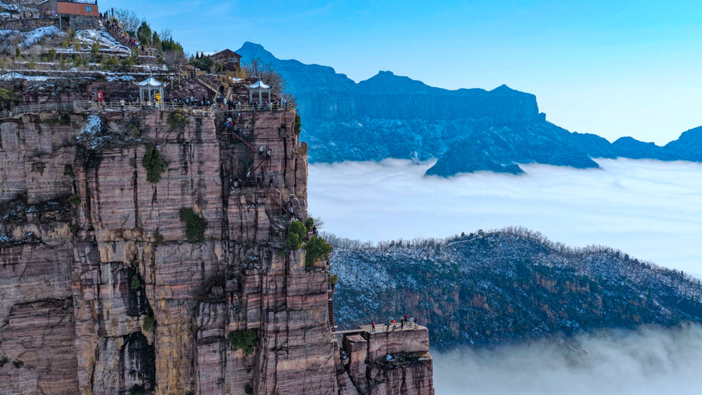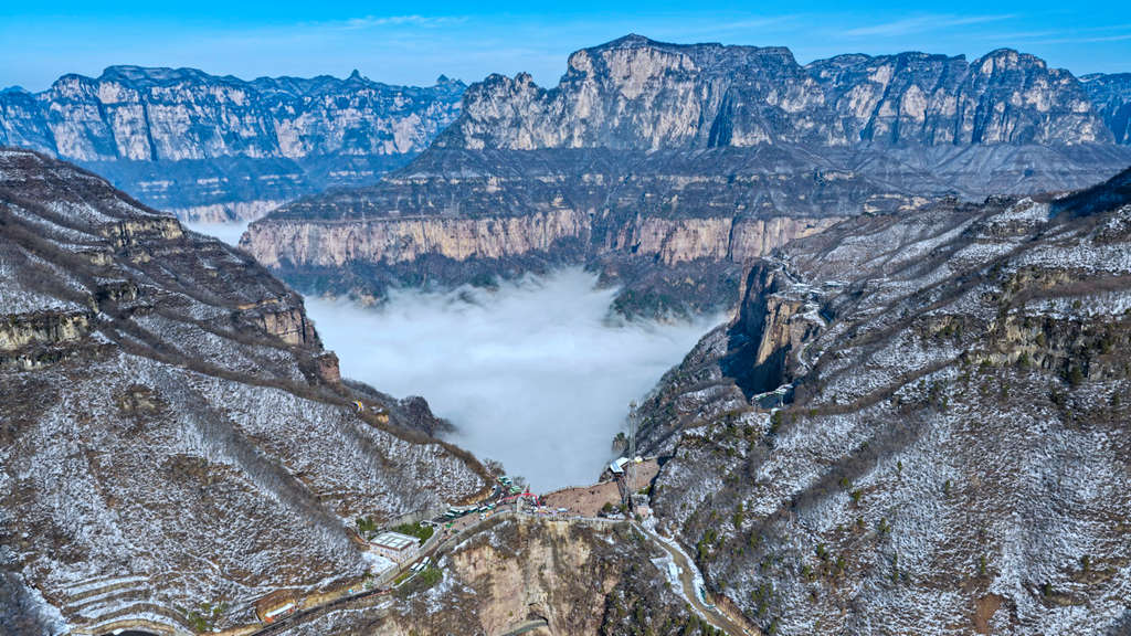 雪后初晴的光影尤为动人,朝阳洒向绝壁长廊,白雪映红岩,冷暖交织、层次丰富;山间云雾时聚时散,山峦若隐若现,栈道悬空、奇峰耸立,构成一幅幅气势磅礴的太行冰雪画卷。