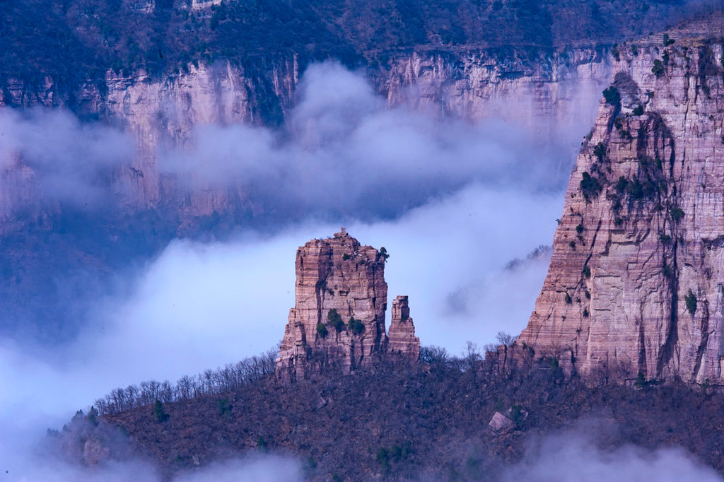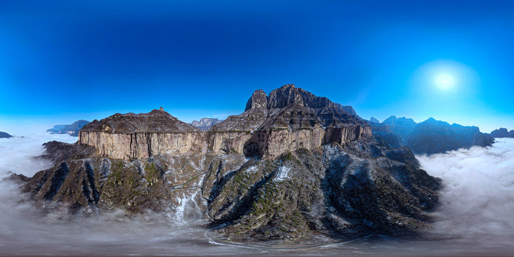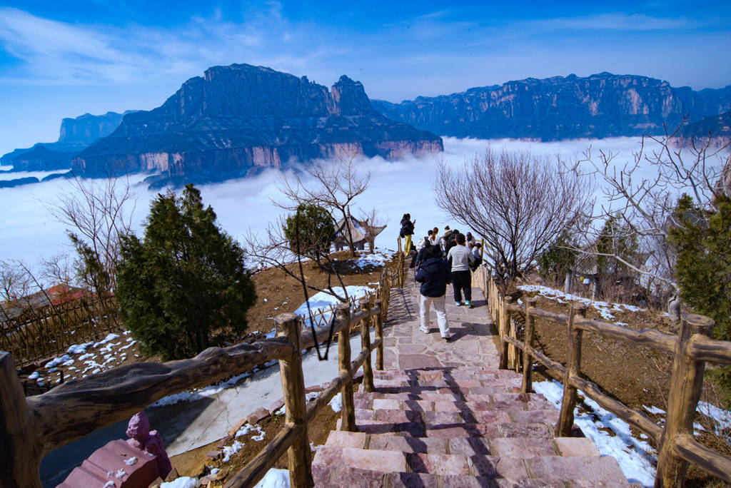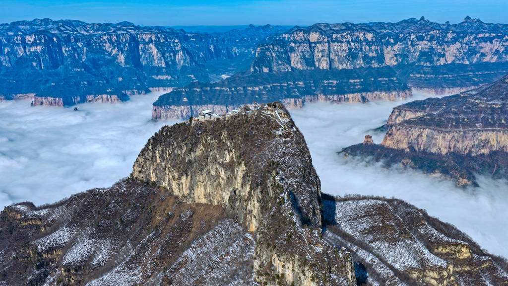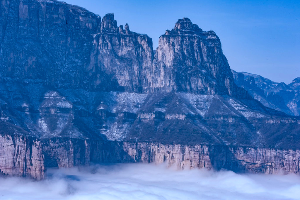 雪后初晴的光影尤为动人,朝阳洒向绝壁长廊,白雪映红岩,冷暖交织、层次丰富;山间云雾时聚时散,山峦若隐若现,栈道悬空、奇峰耸立,构成一幅幅气势磅礴的太行冰雪画卷。