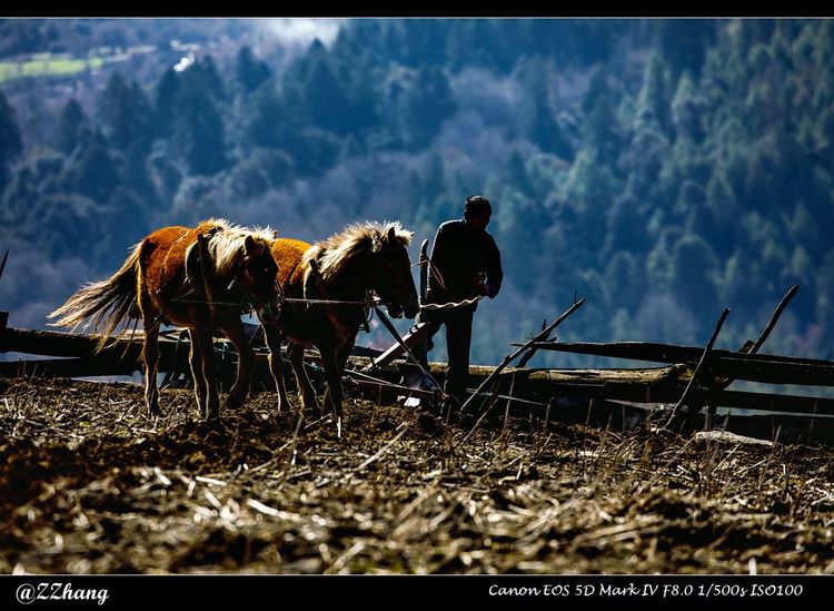 2019年3月28日拍摄于西藏林芝地区波密县古乡卡达村。在山上就听到村里有吆喝声,不知是啥。近前发觉是马耕田。上前套个近乎后,拍了几张照片。