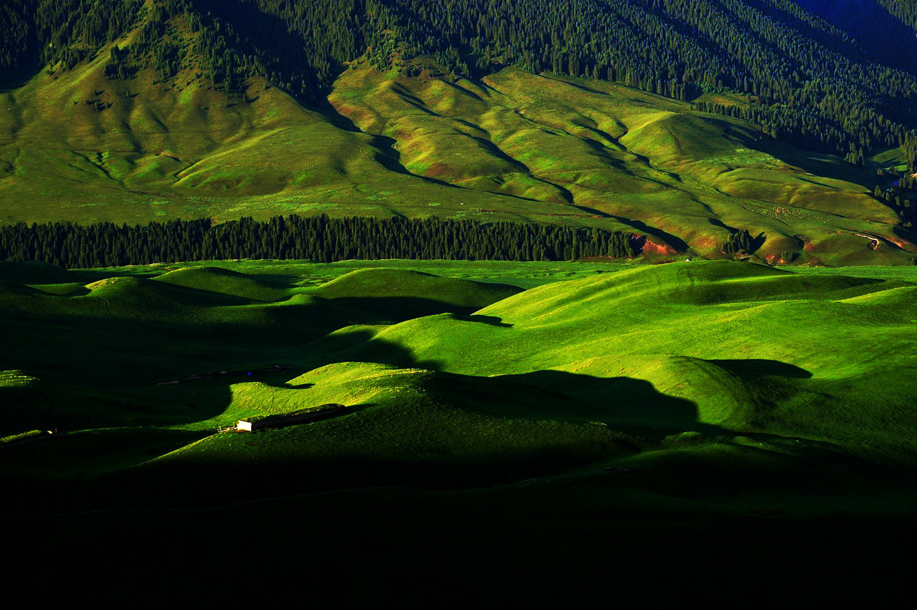 琼库什台草原:位于特克斯县南部山区,与喀拉峻大草原隔河相望。这个天山脚下的美丽草原,在光影的映衬下,起伏的草原加上座座毡房和木屋,使草原充满了生机和活力,令无数摄影人向往!琼库什台村是一个以哈萨克族为主的牧业村,房屋建筑风格独特,目前还保留着很多上个世纪五、六十年代具有哈萨克族游牧民族特色的木屋,进入该村就仿佛进入了一个既有中国西北草原风情又具有美国西部风光的原始村落。