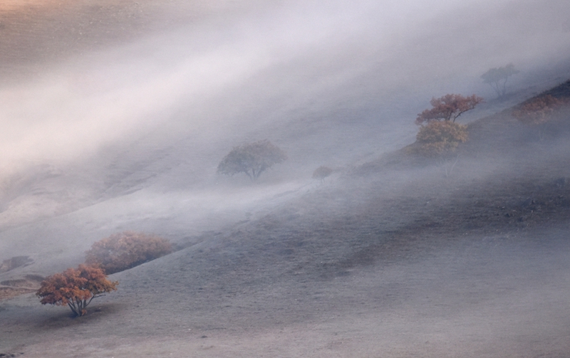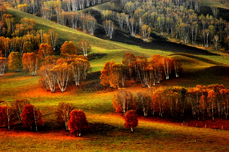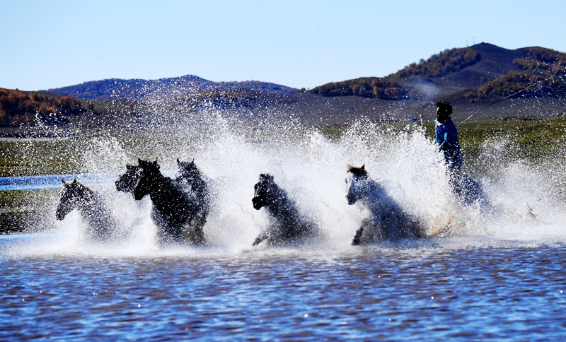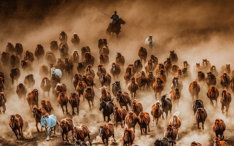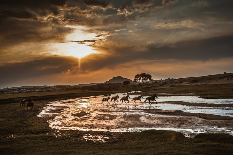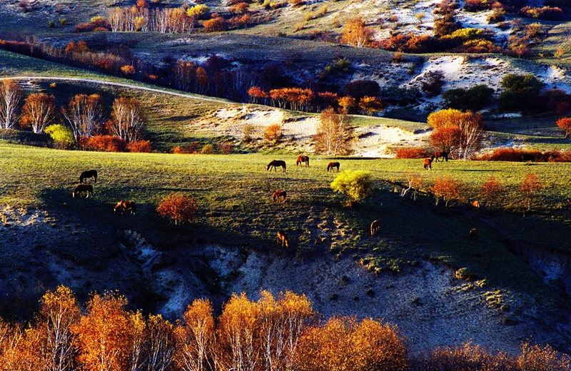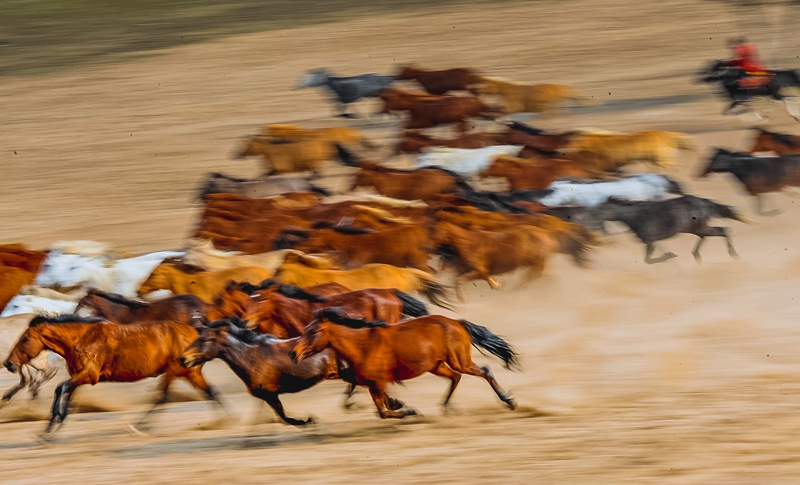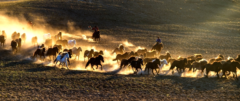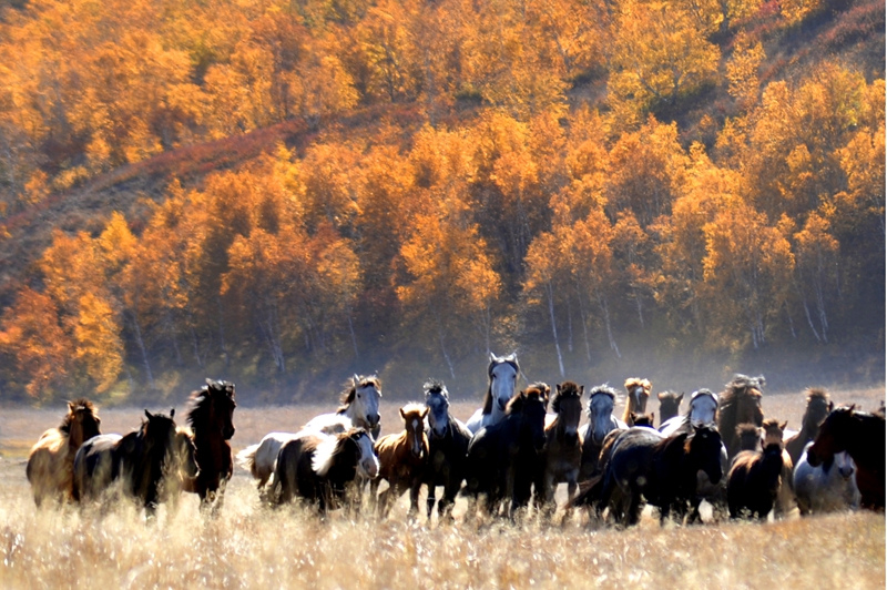 金秋坝上,天高云淡、层林尽染,四季分明的大草原,色彩游戏更被演绎得淋漓尽致,白桦林满树黄金、湖水湛蓝深邃、影视基地晨雾缈缈,五彩山斑斓如画、延绵的山丘线条流畅舒展……那是天然画卷的豪雄壮丽,那是秋色诗篇的浓情美韵。当日出的太阳喷洒出咄咄逼人的烁亮涂抹在草原上,随着放牧人清脆的长鞭声,几百匹骏马出厩,向着金黄色的草原撒蹄狂奔,被灿烂的阳光裹挟着,烈髻舞动,威风凛凛,杂沓的蹄声与扬起长长尘烟的景象,震慑人心,撷取骏马奔跑而激起的精彩瞬间,把大自然的静与动、柔与刚完美地揉合于镜中……