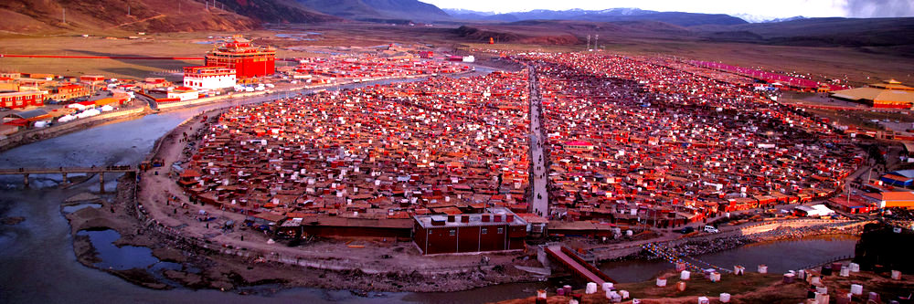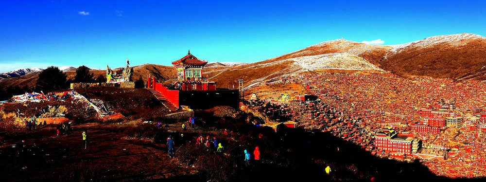 色达五明佛学院:全球最大的佛学院,雄伟壮观,震撼心灵的地方。是藏传佛教寺庙比较集中的地方,全部为红教,当地人有「色达山河一片红」的说法。 这里的僧舍很壮观,连绵数公里的山谷布满了密密麻麻的小木棚屋。谷底和山梁上分布着几座寺庙和佛堂,建筑规模虽都不很大,但装饰考究而辉煌;身披桨红色僧袍的喇嘛和尼姑来来往往,空气中充满生机和祥和气氛。