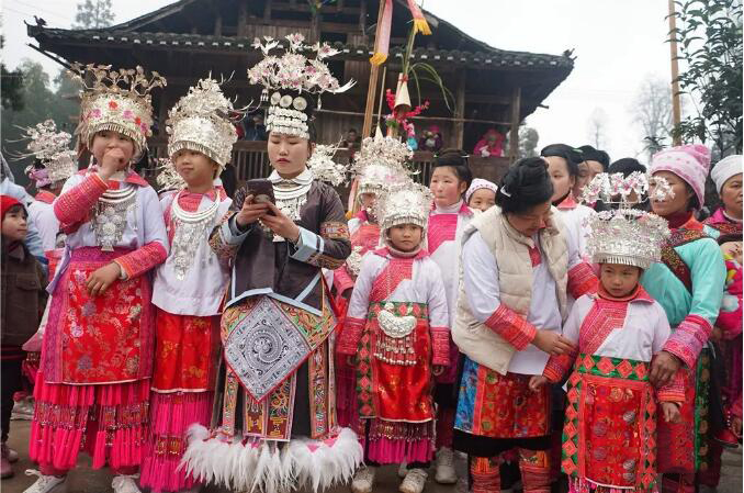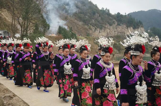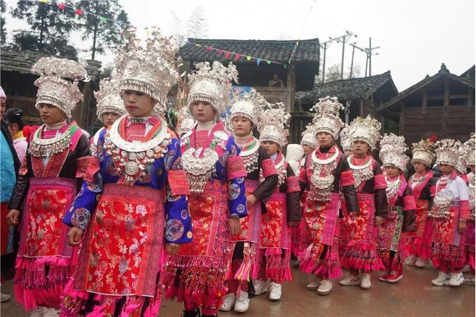 月亮山苗寨是一支古老的苗族支系,服饰做工繁琐精致,春节的踩芦笙也是独具一格。