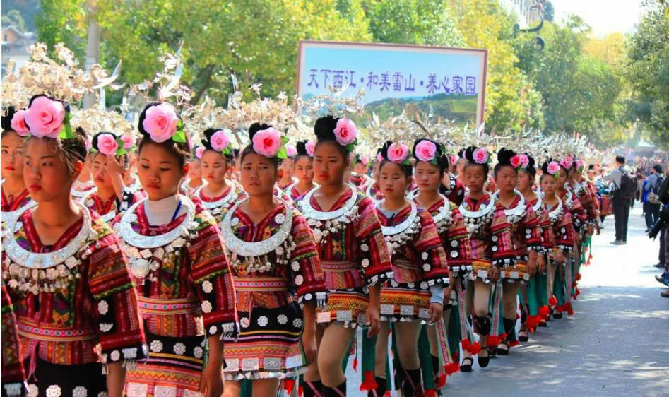 行程的重头戏,雷山参加一年一度的苗年节,用过早餐,驱车来到苗族自治县雷山,这里早已人声鼎沸,满大街的苗族同胞着民族盛装,在街上游走,等待着大型的游行活动,今日至少可以一睹百苗中的十几种苗族的盛装哟!游行队伍一般游览路线是雷山一中出发,终点在雷山体育场。