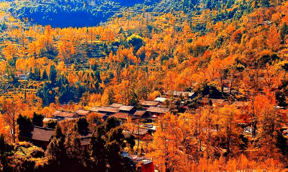 中国古银杏之乡妥乐村拥有古银杏1500多棵,是世界上古银杏生长密度最高,保存最完好的地方。一到秋天,这片银杏林就犹如仙境,隐秘在金黄的树叶中的村子,静谧平和。