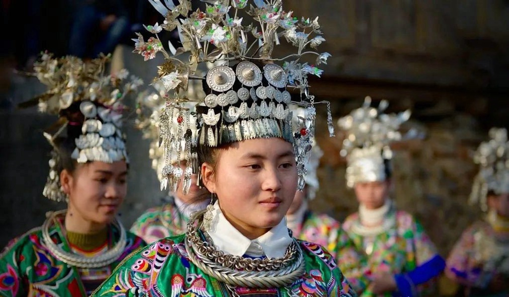 4、锦鸡苗寨:相传这里的苗族先祖因战争被迫向西迁徙,是美丽的锦鸡帮助他们找到了最后定居的地方,在开耕造田时,锦鸡衔来稻谷种子,因此锦鸡被视为他们的图腾;盛装时,头戴银发簪,发鬓插锦鸡飞舞造型的银饰及银梳、银雀花等,靓丽迷人。细心之人会发现,他们的头式非常古朴,深有大唐遗风的特色。