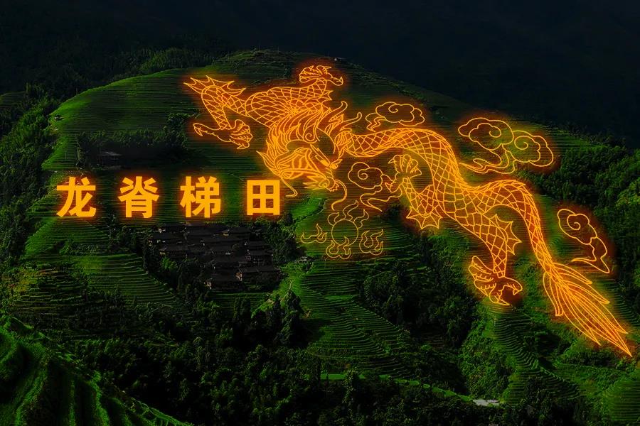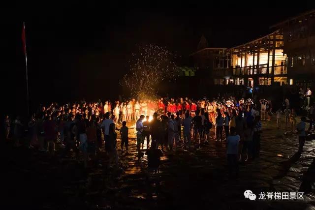 夜色渐暗梯田上的火把逐渐汇集起来,构成一幅“神龙”及“龙脊梯田”字样的美丽画面,绚丽多彩。梯田上空放起了烟花,刹时,烈焰腾空,响彻云霄,场面壮观。