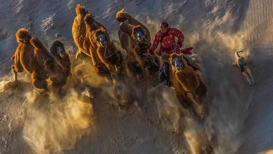 D3、早起拍摄驼户人家日出,驼队日出,拍摄结束后在景区早餐,早餐后拍摄蒙古族情景人像、知青岁月情景人像。下午拍摄群驼冲沙(20--30峰),驼队日落。