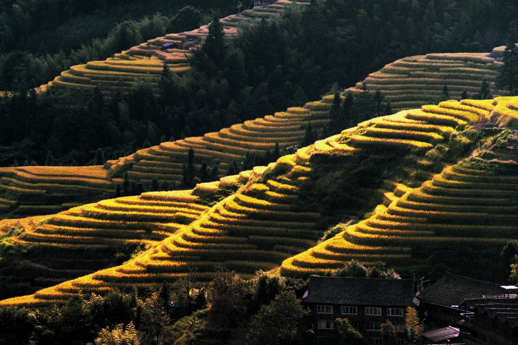 下午,金坑观景区2号点(千层天梯)拍摄夕阳下的梯田景观。9月底-10月,是第3次拍摄龙脊梯田的好时机。此时的稻田正悄悄的换上了黄色的衣衫,色彩艳丽,农家的木屋前后晒满了红辣椒、玉米等农作物,寨子里一派丰收的景象。秋季的龙脊早晚也容易出现早霞,有时还会碰到耶稣光,晨雾在阳光的照射下,影调层次丰富、透视感强。
