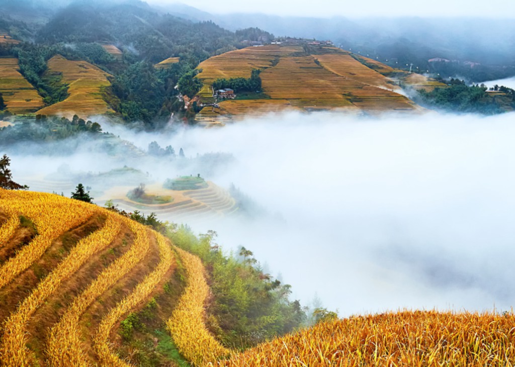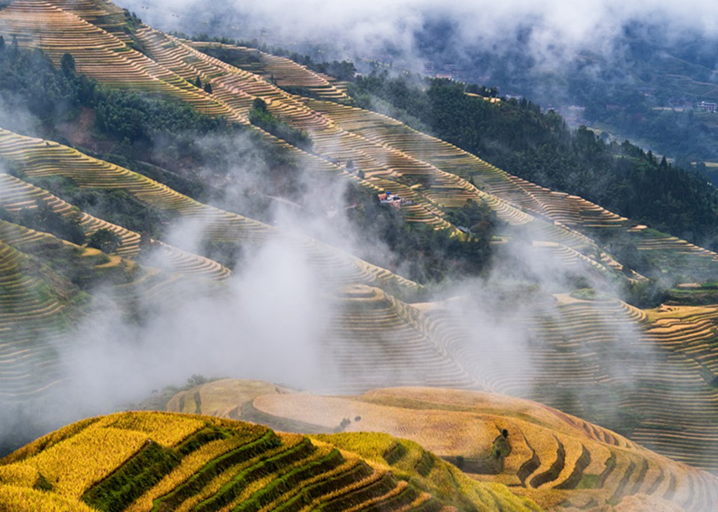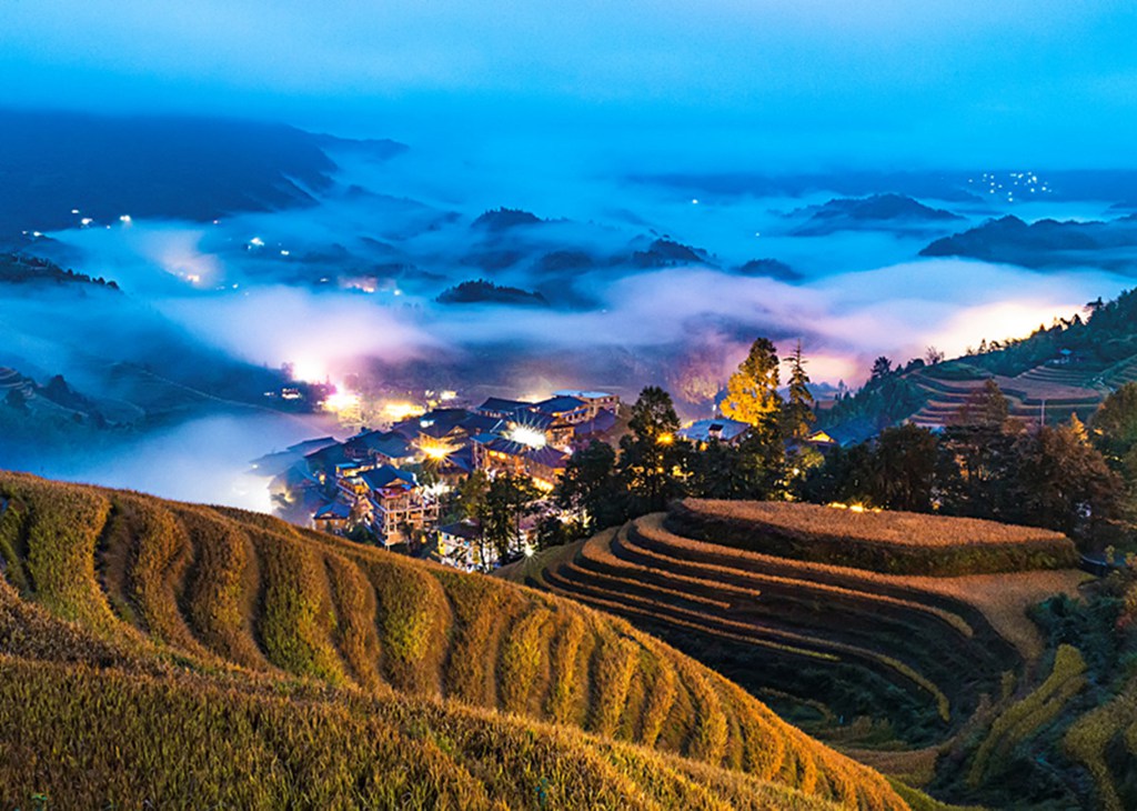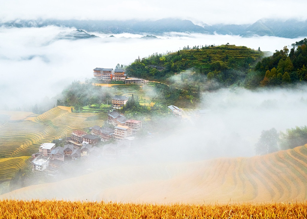 早起,拍摄古桥田园日出风光:这里有典型的喀斯特山群,有山雾迷蒙中的小桥流水,有陶渊明笔下的田舍,有拉着耕牛犁地的村民…….日出时分,朝阳和霞光,倒映在田间的水池,美得就像古诗词里描绘的意境。拍摄完毕用早餐,适时车往龙脊梯田,入住山上旅馆(车程约3.5小时左右)。