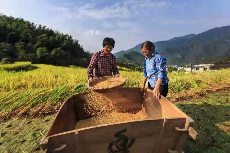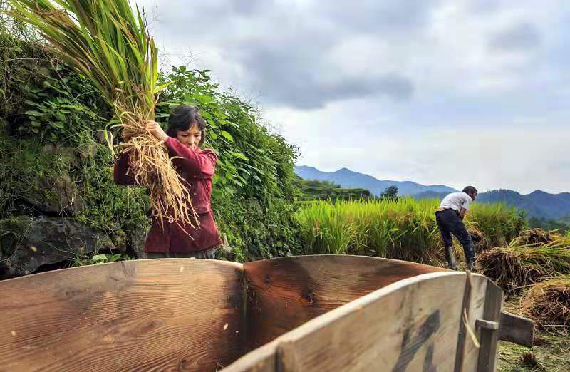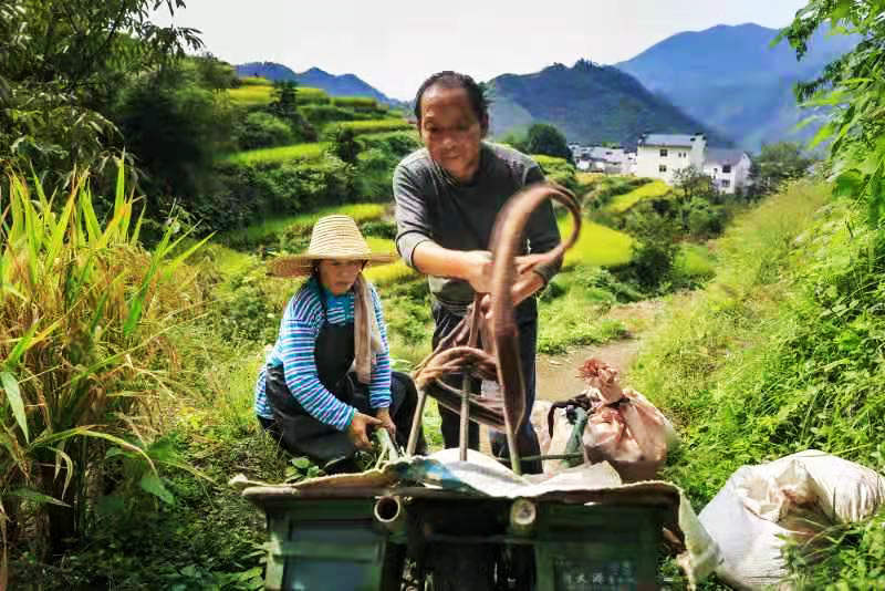 1、 源上梯田最原始收割稻谷场景。从古至今一直用镰刀手工割稻,用最原始的稻戽手工脱粒摔打稻谷,单轮推车一直是山区梯田农民运稻谷的工具。这种原始的劳动场景,在当今时代已经极其少见。现在的年轻人都去县城打工了。只有老年人还在坚守着祖辈留下来的土地。这片壮美的梯田正在面临荒芜,传统的手工收割也随着梯田的荒芜而消失。今天的记录也许就是一种回忆了。