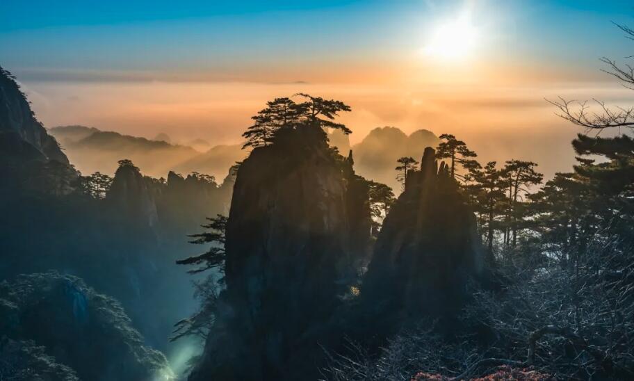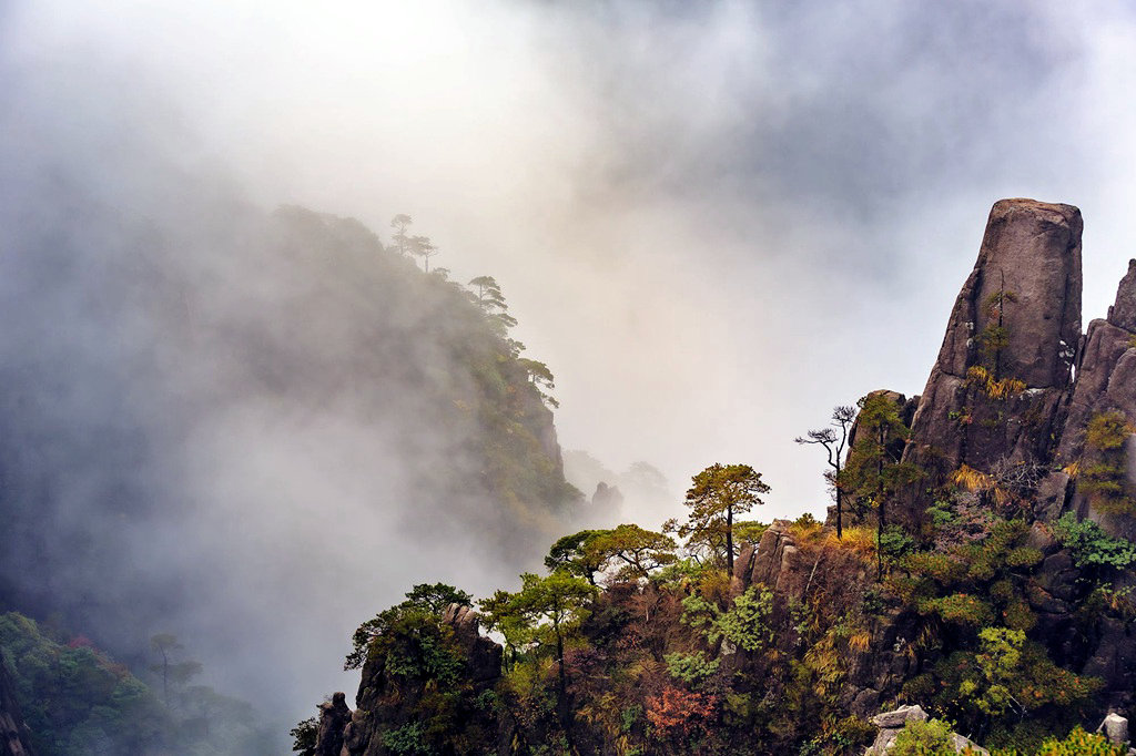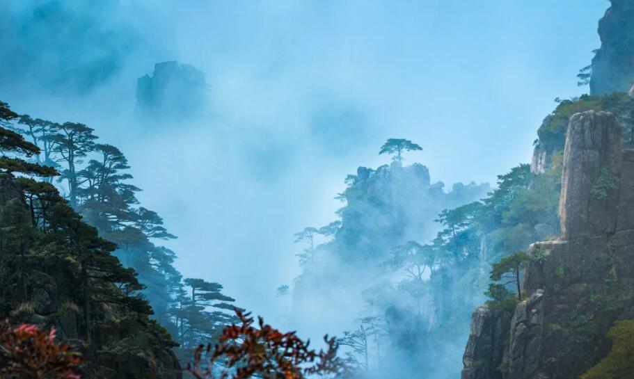 2、黄山最美秋色时节。满山遍野的红叶和虚无缥缈的云雾,五色纷披,仿佛走进安徒生的童话世界,如一幅色彩丰富的油画。
