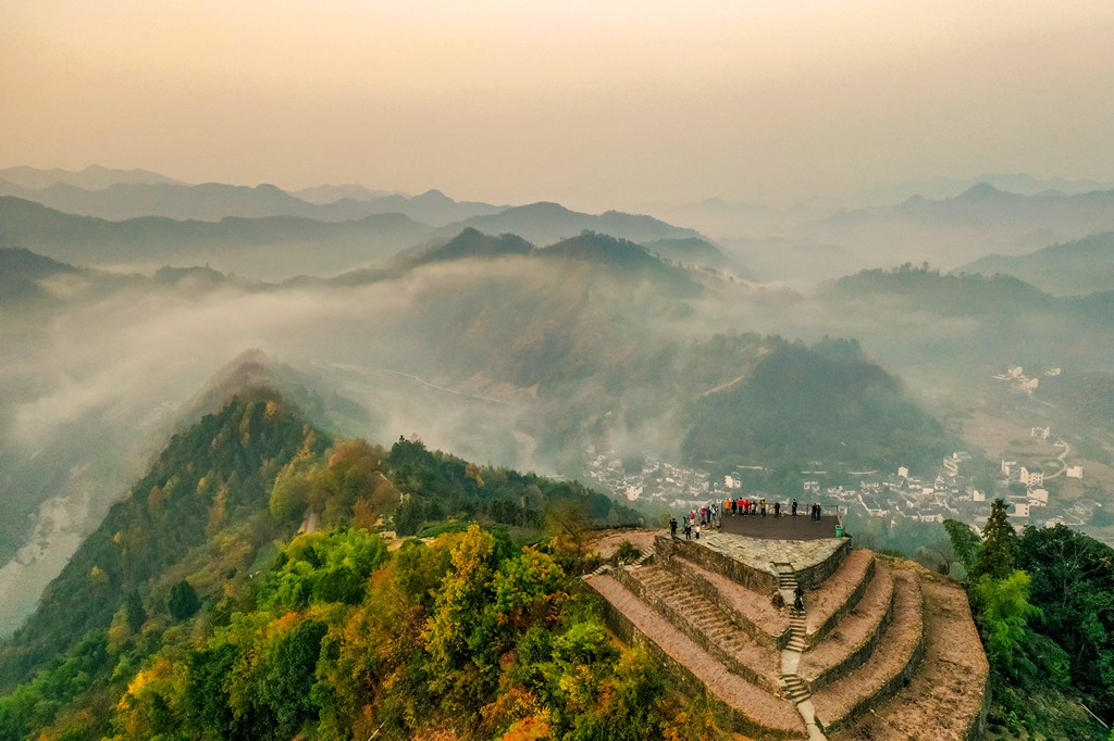 D8天:早起换乘小面包车上山,拍摄高山土楼秋色云海日出风光,阳产土楼,位于皖南山区的群山之中,是一个依山而筑的小山寨。这里由于地势高,交通不便,数百年来,山民就地取材,采周边青石铺路架桥,取红壤木材筑巢而居,日出而作,日入而息,渴饮山泉,饿食五谷,,多种农作物生长,子孙延续。流年之中,形成了鳞次栉比、错落有致、质朴壮观的土楼群。每年秋收以后 ,家家户户会把收获的玉米、黄豆、红辣椒 、红豆等等农作物,放在房顶晾晒便于储存,这也形成了一道另类的嗮秋风景。