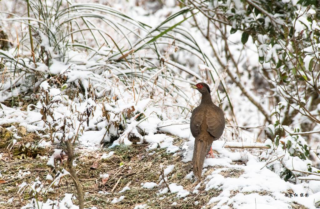 秋冬的福建三明,成了白鹇的天然舞台。山林褪去盛夏的浓绿,露出赭红的岩壁与深褐的枝桠,反倒让白鹇的羽毛愈发抢眼;雄鸟的白羽如上好的绸缎,在斜射的阳光里泛着珍珠光泽,尾羽拖曳过铺满落叶的地面,像蘸了墨的笔在黄褐相间的林间划过;雌鸟的羽色虽偏暗褐,却与枯藤、苔藓浑然一体,起落间带着几分林间精灵的隐秘感。