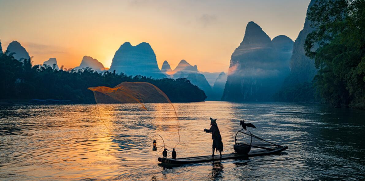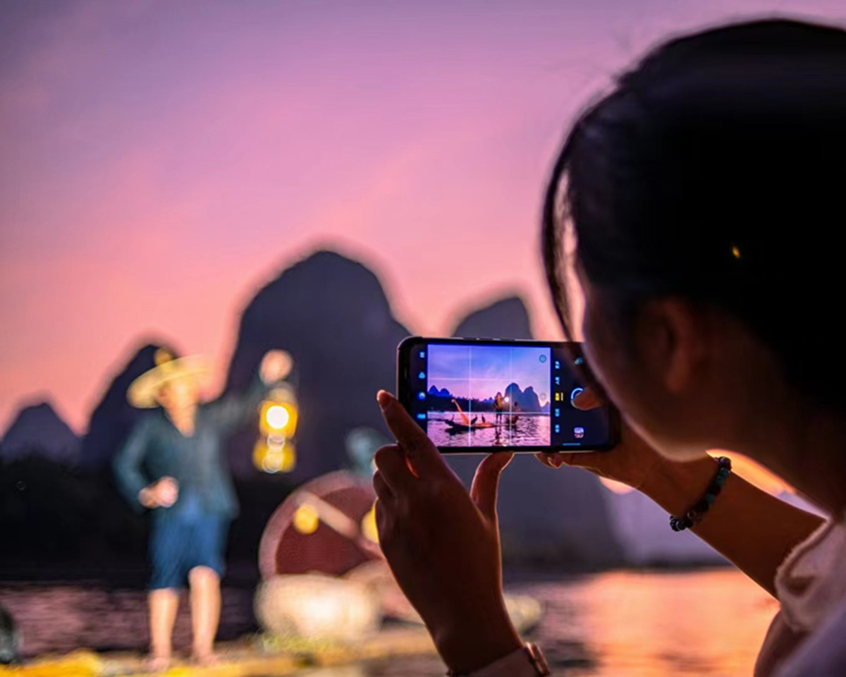 在兴坪古镇的老渡口,导师示范捕捉 20 元人民币背景的晨雾奇观,渔翁的竹篙点水时,鸬鹚振翅的瞬间被高速快门凝固成金色剪影;阳朔遇龙河的竹筏漂流段,特别安排低角度仰拍,让青山倒悬水面的倒影与撑筏人形成几何对仗,慢门拍摄时水流如丝,将田园诗酿成流动的光影画卷。