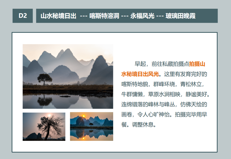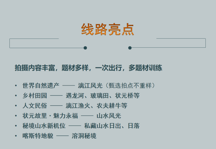 更多摄影路线点击链接: 秀美漓江、阳朔美景、乡村田园魅力永福风光人文6天深度摄影特训营/国协大赛助力