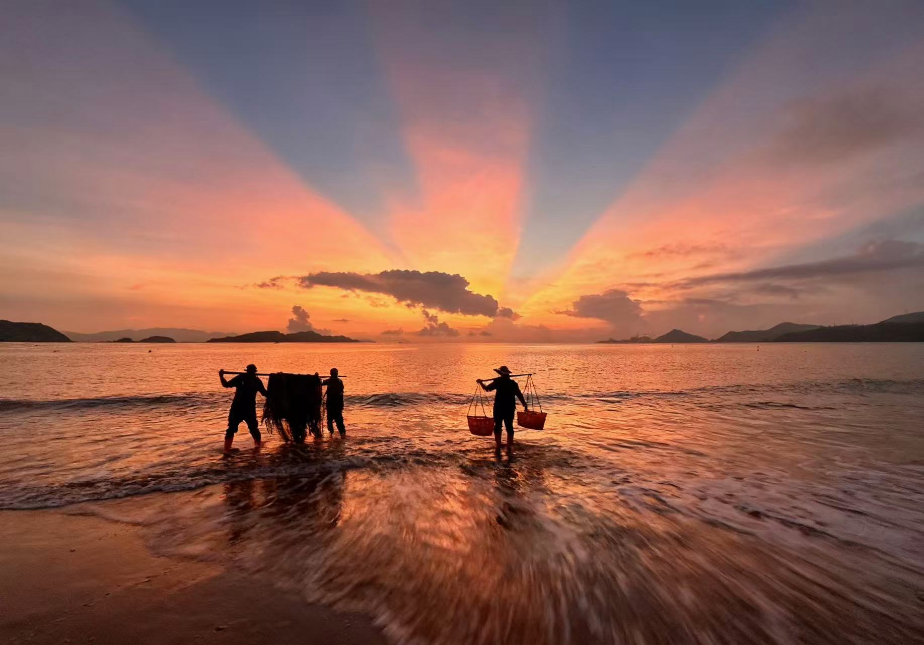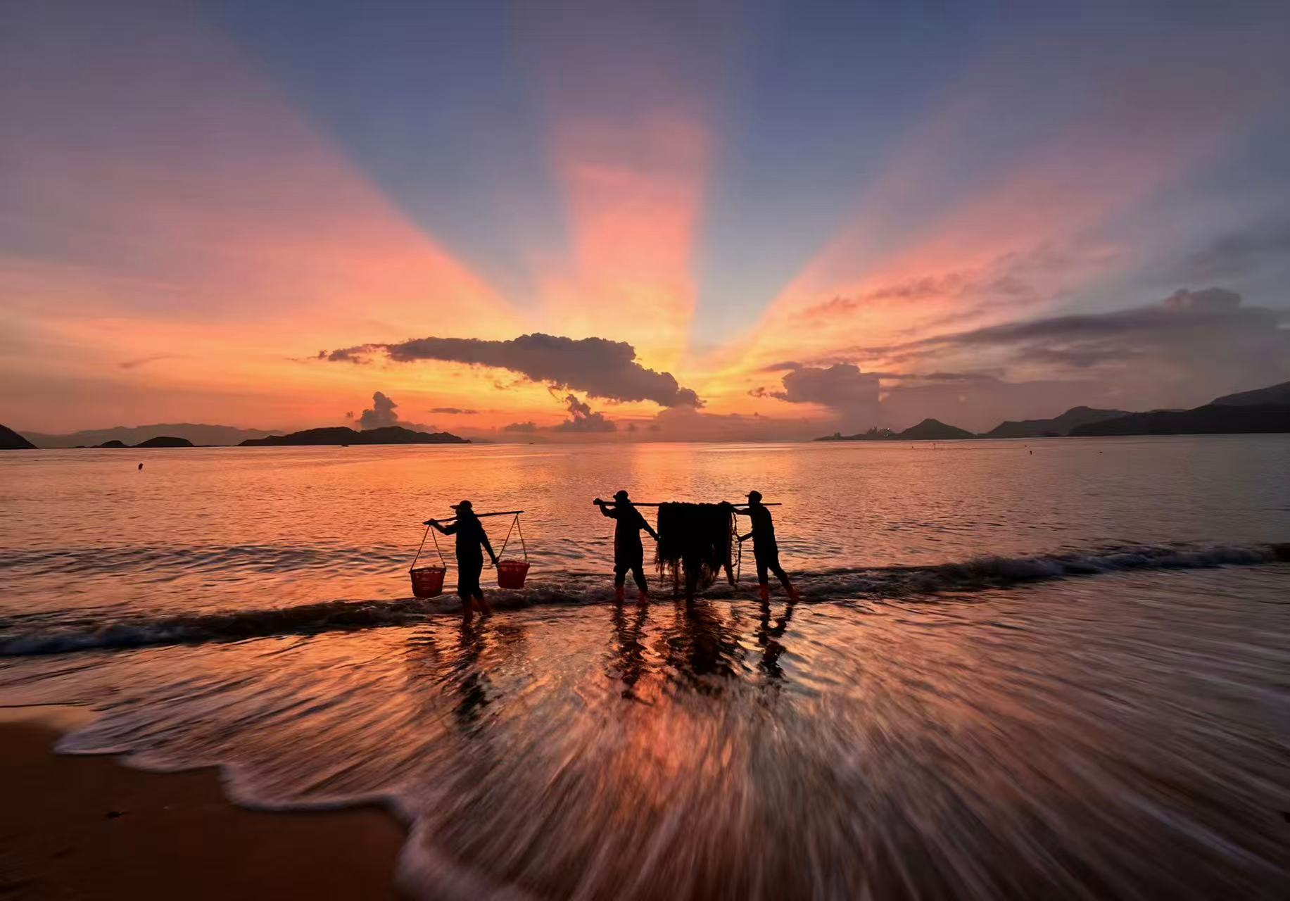 早起出发北兜沙滩,拍摄日出风光,渔民赶海人文;随后去拍摄织网。结束后回酒店早餐休息,中午午餐。