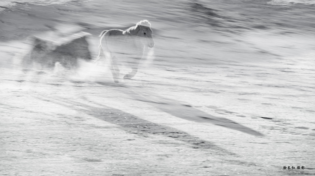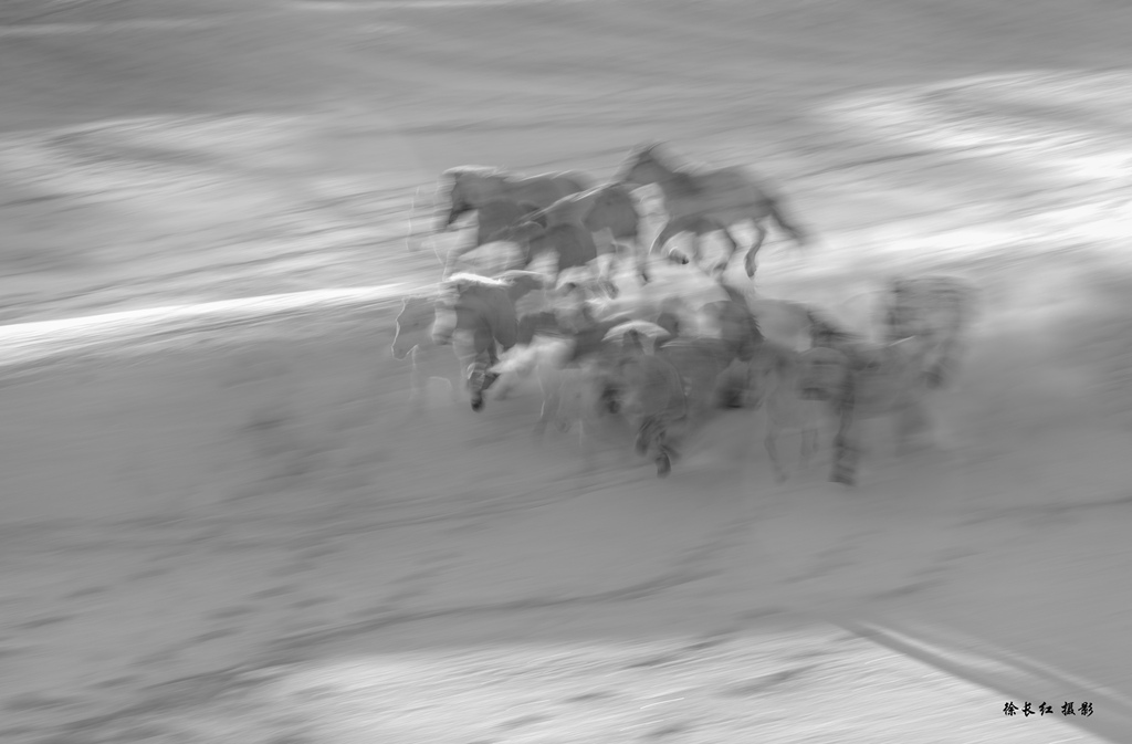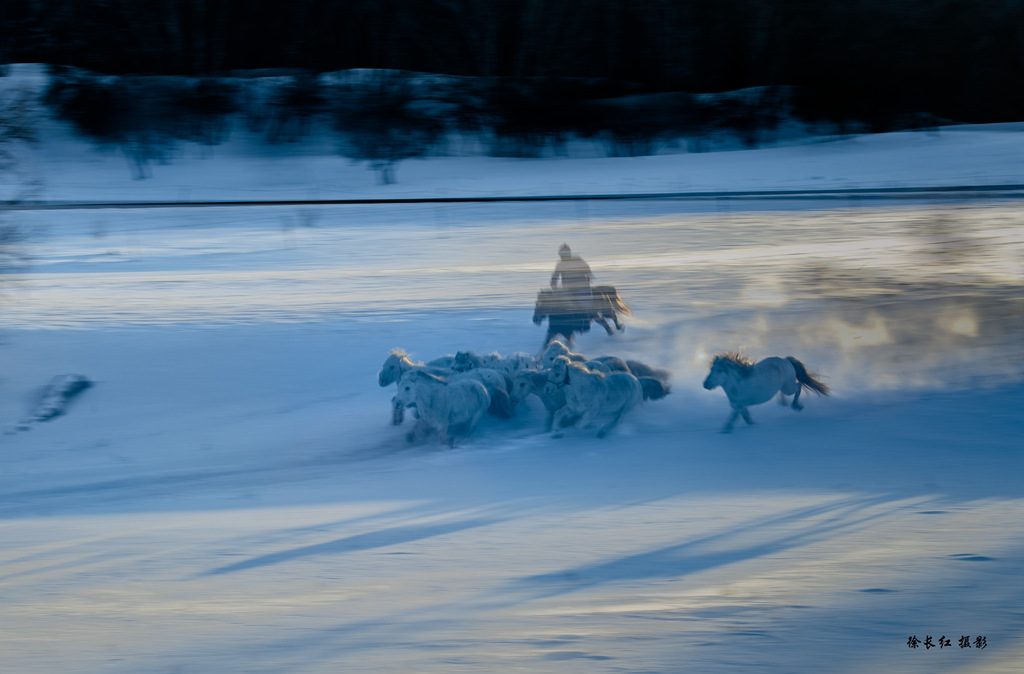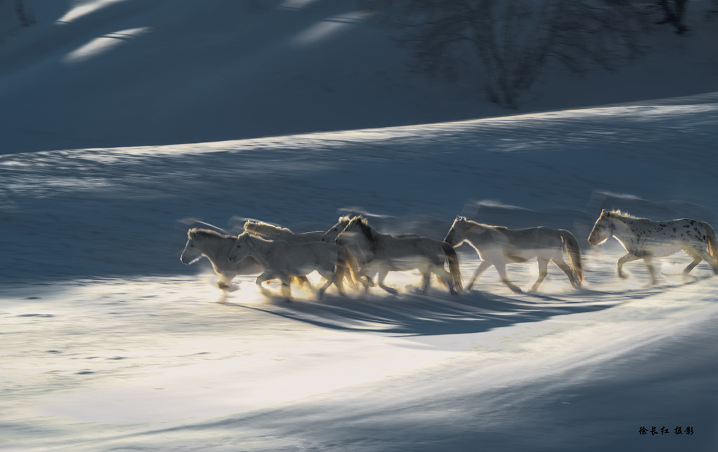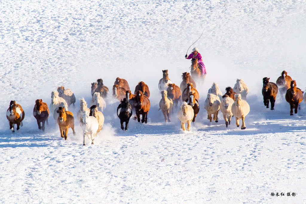 当第一缕晨光刺破苍穹,洒在银装素裹的乌兰布统草原上,地平线处传来闷雷般的震动。转瞬间,成群的蒙古马如潮水般涌现,在纯白的大地上划出有力的痕迹。