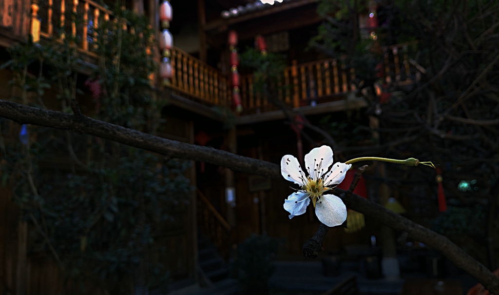 当天我们就来到了巍山古城,住下后为明天的拍摄准备着....第七天,大家早早起来,在街道用过早餐后,前往菜市场拍摄,这里的菜市场还是很有特色的。在客寨的院子里,看到了一个正在开放的梨花,雪白的花瓣,久别的相似挂记心头,小时候,在外婆家,有两棵梨树,一到春天就开花,甚是漂亮。今天再次见到,顿觉亲切,突然发现,一棵树,一枝花,而且是在12月份开花,甚是好奇,就拍摄下来分享给大家。祝愿大家花好月圆,好运连连!