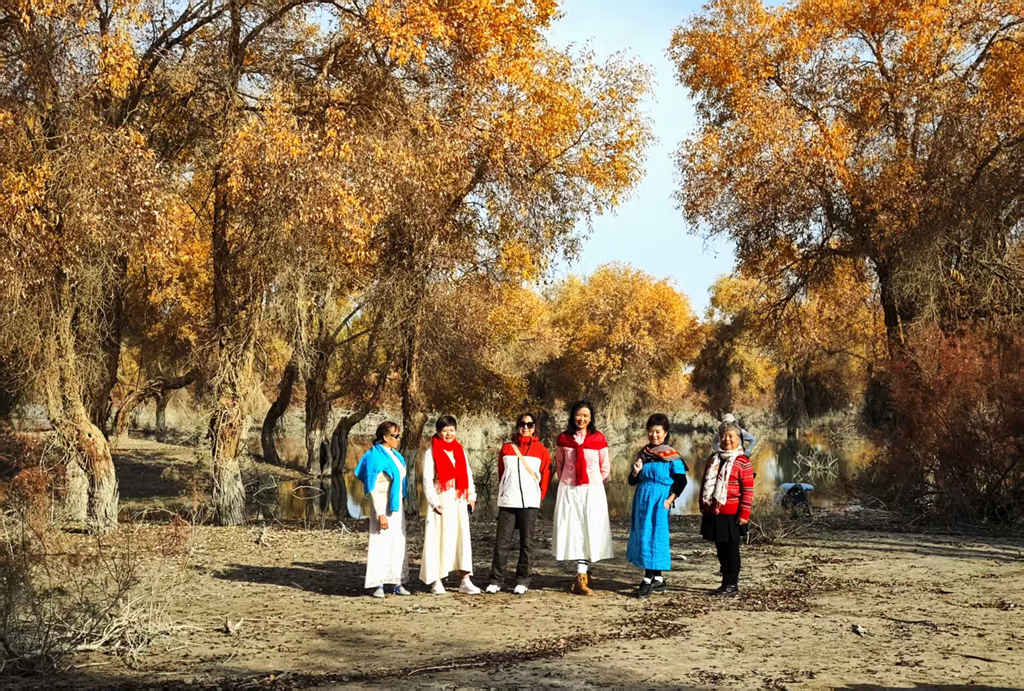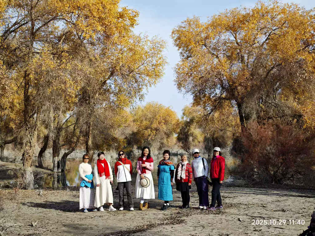 正午的巴楚红海景区,阳光穿透胡杨层叠的枝叶,在沙地上洒下斑驳的金影。300 多万亩原始胡杨如同金色的海洋,粗壮的枝干遒劲如铁,金黄的叶片在微风中簌簌作响,远处的喀什河湿地倒映着蓝天与胡杨,构成一幅浑然天成的油画。我们摄影团的三十余人,在领队的指挥下,以一片 “生而千年不死” 的胡杨林为背景,错落排列成扇形。有人肩扛三脚架,有人怀抱相机包,每个人的脸上都沾着细碎的沙粒,却难掩眼里的兴奋与执着。