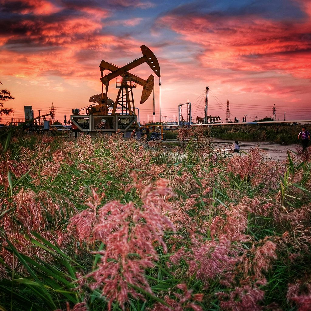 盘锦油田矿区拍摄芦苇荡里的高密度采油机和油田的井区