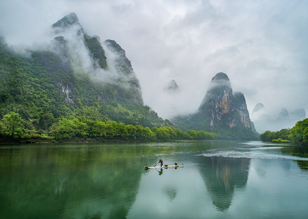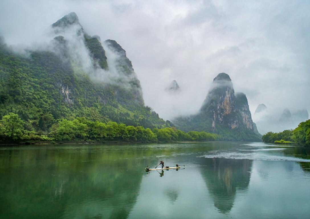 漓江晨雾、细雨朦胧、山水如墨,烟雨季节(3-5月)江面薄雾氤氲,远山若隐若现,呈现水墨画般的意境。