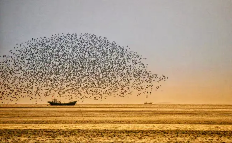 鸭绿江口湿地位于黄海生态区最北端,靠近俄罗斯远东地区和美国阿拉斯加等繁殖地,是黄(渤)海迁徙线路上重要的停歇地和补给地。 鸟浪景观特色:这里的鸻鹬类水鸟主要由斑尾塍鹬、大滨鹬和黑腹滨鹬组成。每年 3 月下旬,来自越冬地的迁徙鸻鹬类水鸟陆续抵达,进入 4 月迎来最佳观鸟时段。在潮水奔涌之际,鸟群随之起落,形成一阵阵壮观的 “鸟浪..