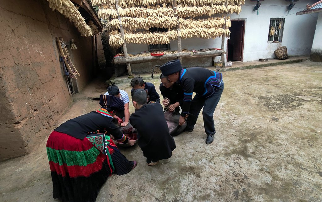 彝族杀年猪十分讲究, 年猪一般是喂养了一年的黑猪, 而且越肥越好。早晨鸡叫后,