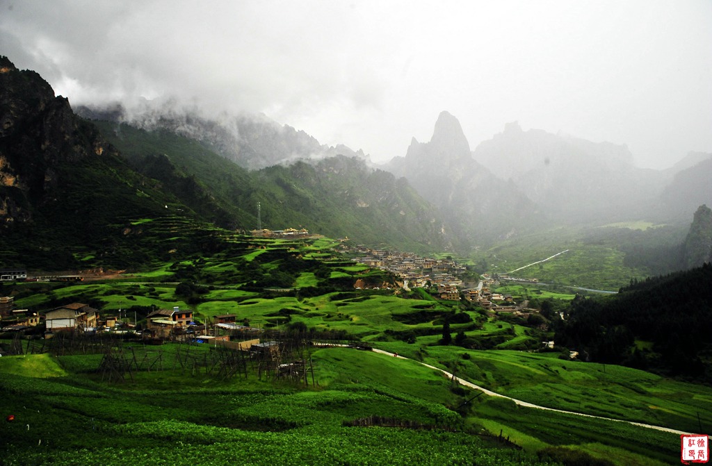 沿黑水河顺流而上,两岸青山碧绿,空气清新,经过古藏寨,继续前行,参天的古树郁郁葱葱,高山峡谷风情尽收眼底,牛羊成群,当天气晴朗时,在草甸上就可以远眺冰川,三块冰川就似挂在天边的帷幕一般,和蓝天、白云浑为一体,厅妙之极。原始森林、高山草甸、山间小溪尽情地修饰着她,将她半点得美轮美奂,此情此景不收使人联想起陶渊明笔下的世外桃源、人间仙境..