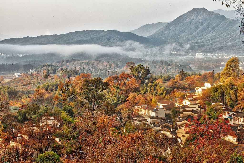 塔川秋色以红叶著称,但主要指乌桕红叶,村落田野中错落有致的乌桕叶子红了,形成了一幅迷人的田园风光画卷。