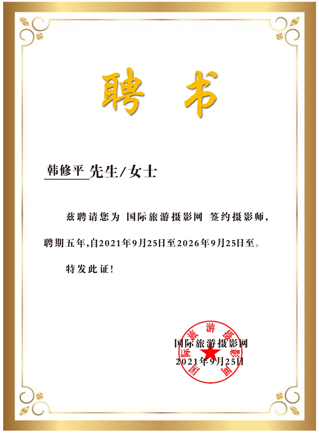 恭喜韩修平老师成为国际旅游摄影网签约摄影师