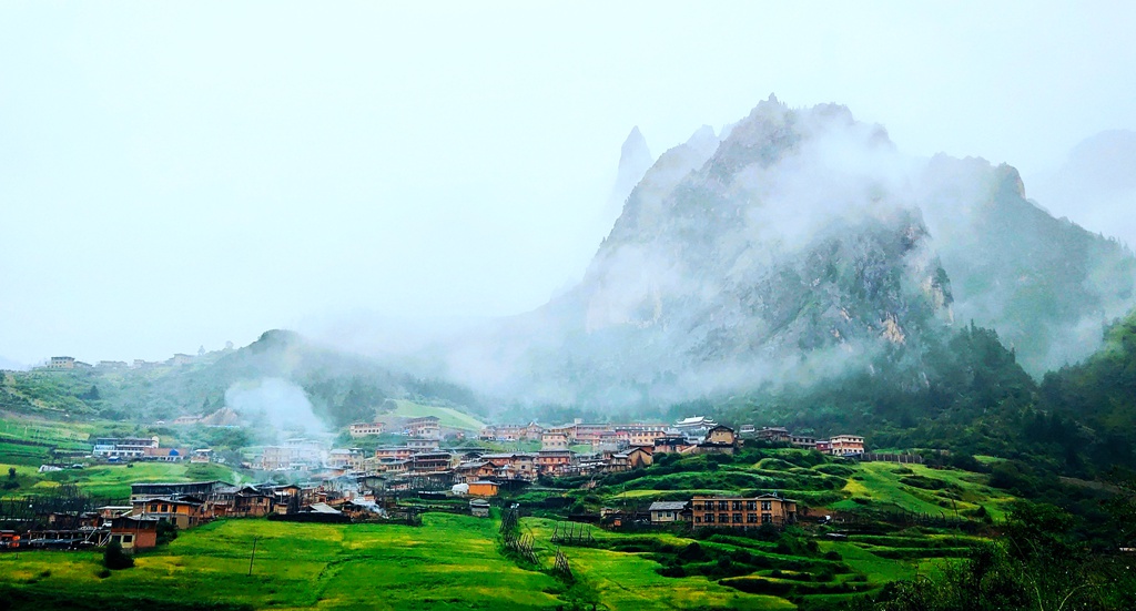 扎尕那是一座天然的石头城,四面环山,山石嶙峋,直插云霄,云雾缭绕,宛如仙境,常被称为陶渊明所说的”世外桃源”
