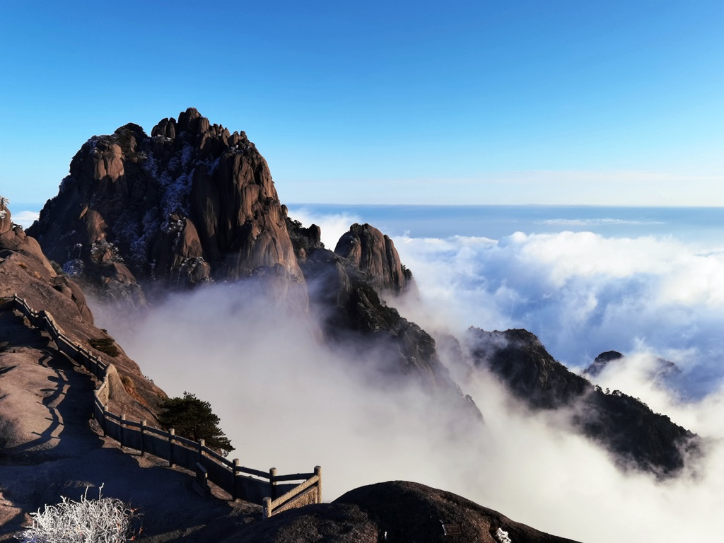 冬天是黄山一年四季中云海出现的最多的季节,冬天时节黄山树披“雾凇”,是一番与凇花江畔不同的绝景,卧雪的怪石则更显嶙峋清奇