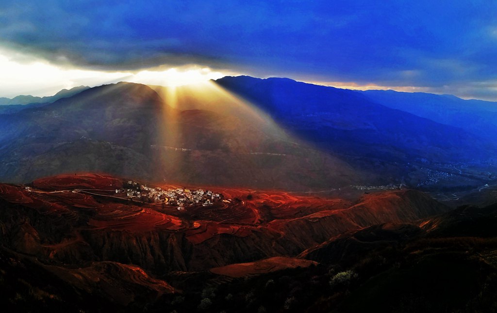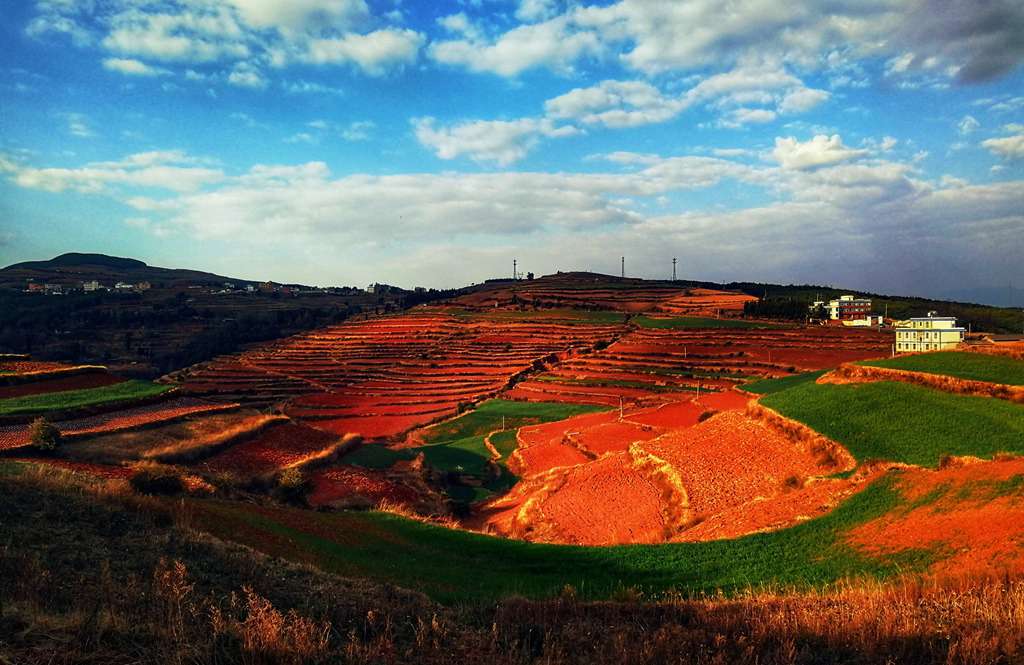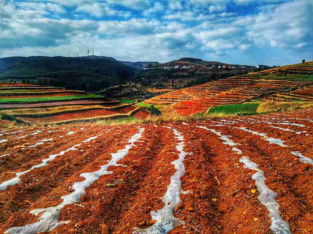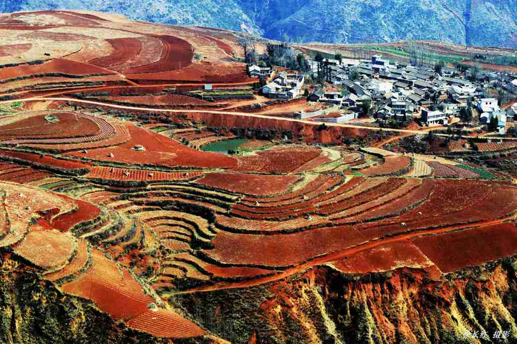 东川红土地地处乌蒙山区,属高原山区地貌,此地山岭纵横交错,出峦起伏不平,红土丘陵一望无际,加之季风影响,形成了气候温和、干湿分明的高原季风型气候。到红土地摄影最好的季节是9到12月,这个季节油菜、土豆、荞麦正在陆续收获,冬小麦正在发芽拔节,还有路旁、村子旁、树林里的杨树黄了,漆树红了;其次是1、2月,这时小麦生长正旺,月亮田里放满了..