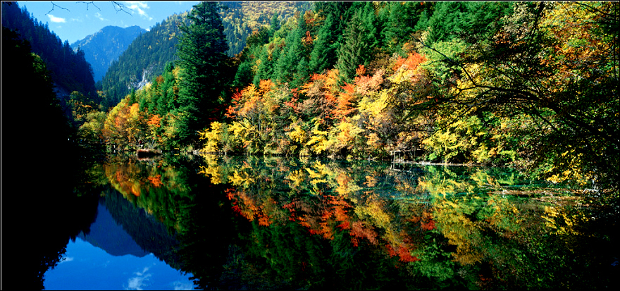 水是九寨的灵魂,金秋时节,九寨沟水光山色,光艳照人,恰如一个风华正茂的女人,丰润美艳,风姿绰约,多一分成熟则暗藏零落,少一分风华则略显青涩;无时无刻不在演绎着色彩与光影构成的梦幻,美艳得令人刻骨铭心为之意乱神迷;