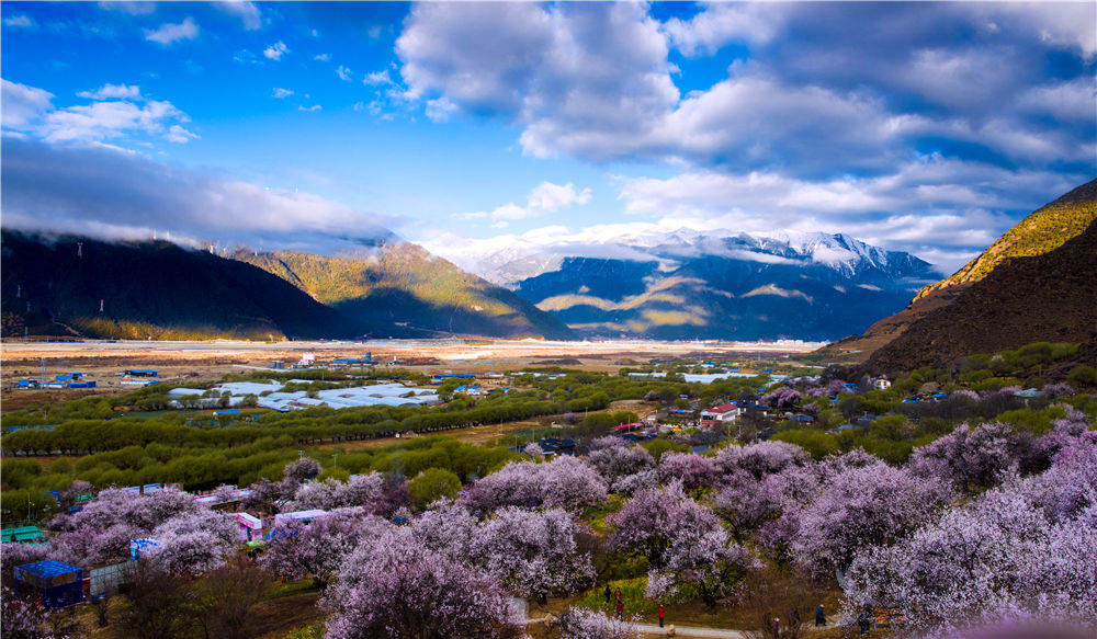 西藏大部分地区在初春的三、四月份仍是冰天雪地、天寒地冻,巍峨的雪峰还是茫茫白雪覆盖,但此时林芝、波密、雅鲁藏布江两岸的藏村落,已是桃花盛开,这里素有“西藏江南”之称,由于受垂直气温的影响,这里的春天来得特别早,抬眼望去,粉白色的桃林、翠绿色的柳枝、盛开的桃花、碧蓝色的河水、墨绿色的山体和白雪皑皑的山尖构成世外桃源般的风光。