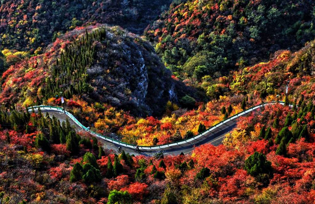 秋天的太行,峰峦叠嶂,层次分明。入秋时间,黄栌吐火,漫山遍红,令人叹为观止。漫步太行深处,漫山遍野,绚丽绯红,碧绿的山野夹带着一片片金黄,偶尔可以看到飘逸群山的云雾,袅袅地穿梭于红叶群海之中。秋之颜色,秋之果实,秋之繁华,秋之韵味,秋天把整座太行山的美丽推向了巅峰,推向了极致。