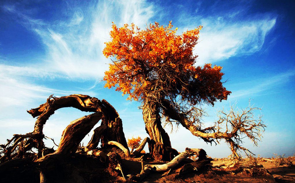 胡杨生长在最恶劣、最残酷的气候环境之中,它们耐寒、耐热、耐碱、耐涝、耐干旱,组成了一条壮阔的绿色长廊,阻挡了沙暴对绿洲的侵袭。它们就算死去,也屹立不倒,仍然用自己坚强的身躯守护着这片土地。